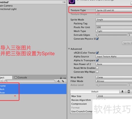 2、 启动Unity并创建新项目,导入三张图片资源,将其设置为Sprite格式,操作步骤所示。
