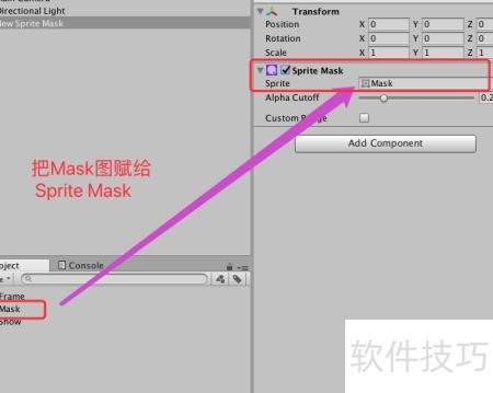 4、 将导入的Mask图片设为New Sprite Mask的遮罩区域,并将其层级顺序调整为1,具体效果所示。