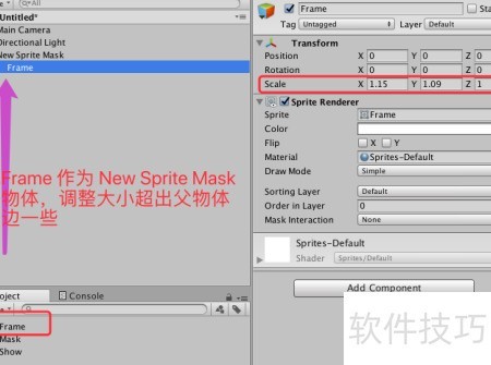 5、 将图片 Frame 拖入 New Sprite Mask 作为其子对象,调整 Frame 尺寸,使其边缘略大于父对象,确保覆盖完整区域,具体效果所示。