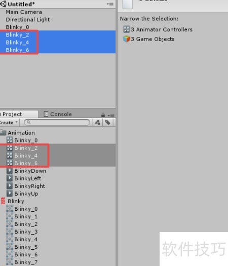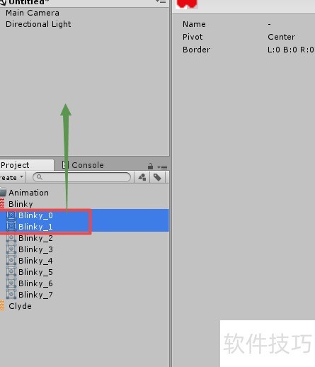 3、 由于导入的图片为成对的动画序列,需选中前两张并拖入层级视图,操作如示意图所示。
