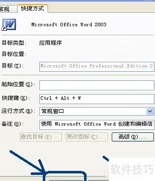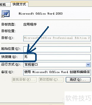 2、 第二步:打开Microsoft Office Word 2003 属性对话框,向下滚动至快捷键文本框(图中蓝色框标注位置),查看其中显示的内容,当前文本框内显示为无。