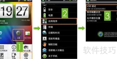 2、 按下手机菜单键,在弹出选项中选择设置,或在应用列表中找到并进入设置程序,接着点击应用程序选项,即可开启USB调试功能。操作简单,按步骤进行即可完成设置。