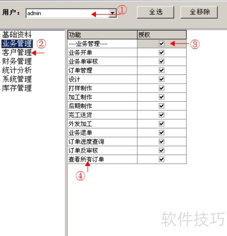 8、 从②中选取需授权的模块分配给此账号