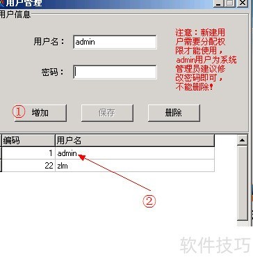 15、 点击①处的添加按钮,在用户名和密码栏中输入新账号的名称与密码。注意:用户名支持中文,密码不可为空。