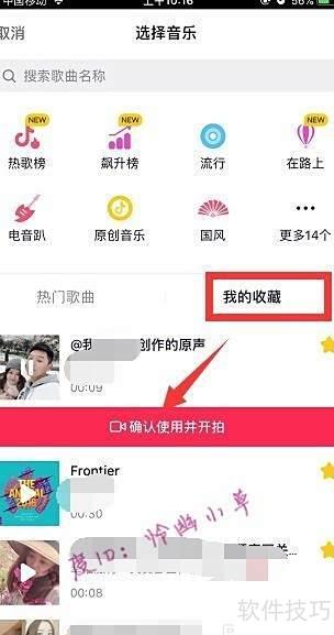 4、 可直接选取音乐或使用已收藏的曲目,点击我的收藏,选定歌曲后确认开始拍摄。