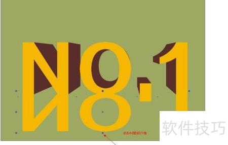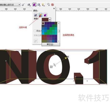 12、 点击工具栏中的立体化工具,将鼠标移至NO.1底部中央,按住并拖动,即可生成所示的立体阴影效果。