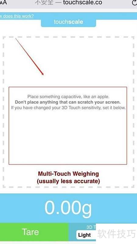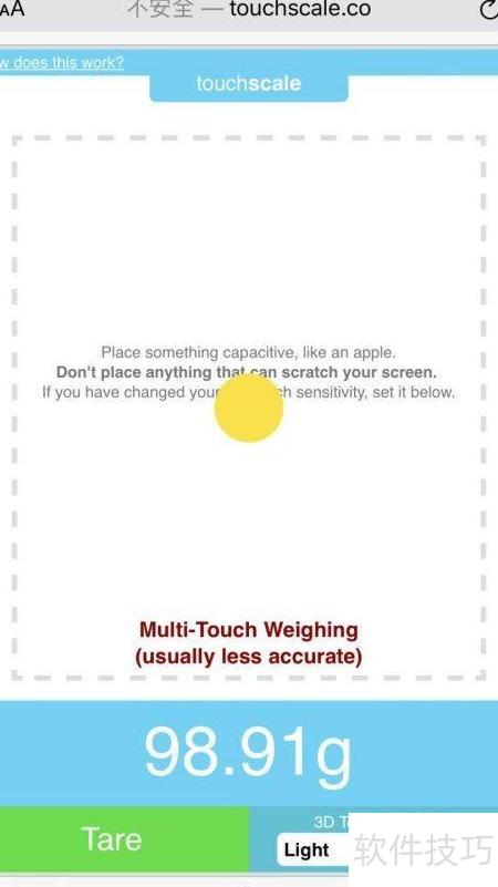 用Safari浏览器搜索touchscale,将物品放在指定区域,待数值稳定后读取结果。