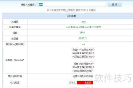 2、 在站长工具中输入关键词,即可快速查询其优化难度,操作简便,省时高效。