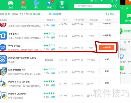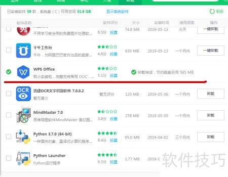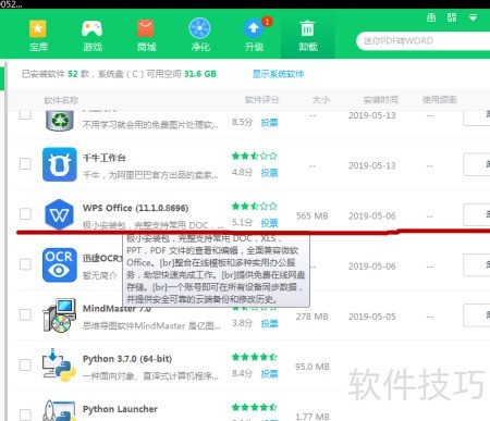 4、 进入删除选项,找到并选中要删除的WPS办公助手。