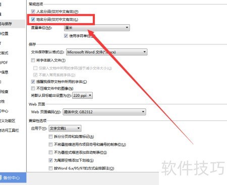 3、 进入常规与保存设置,勾选对应复选框,即可开启WPS的地名分词功能。