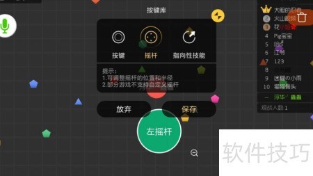 8、 可将摇杆置于屏幕中央或左侧,通过点击按钮旁的加减号调节半径,具体操作方法详见界面提示。