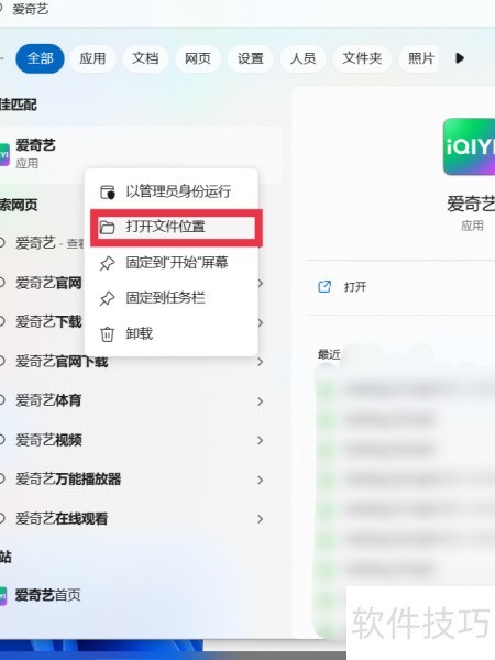 6、 右键点击搜索结果中的软件,选择打开文件所在位置。