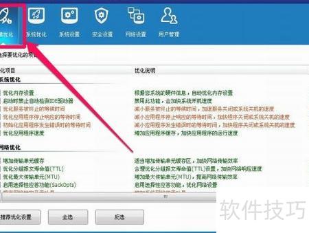 4、 在魔方软件中,进入魔方优化设置大师功能后,可查看系统、网络、安全等多项优化选项。虽然各项设置需手动调整,但推荐直接使用一键优化,操作更便捷高效,能快速完成全面优化,提升系统运行效率与稳定性。