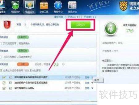 13、 在瑞星主界面选择首页,点击立即优化按钮即可完成系统优化。