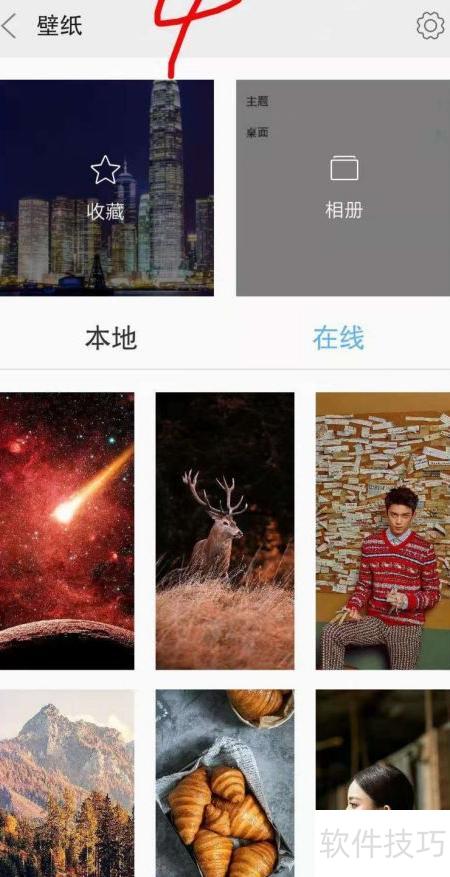 4、 此时可点击收藏、相册、本地或在线,从中选择一张图片设为壁纸。