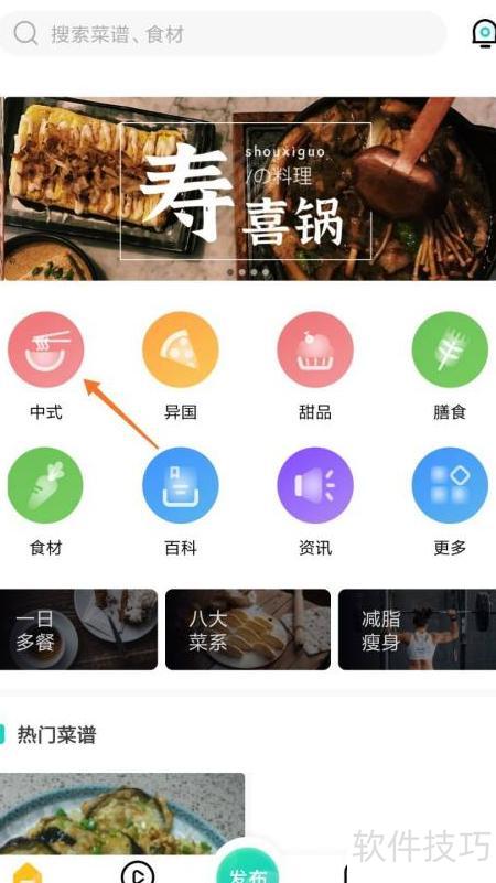 1、 打开饮食记,点击首页并选择中式图标即可。