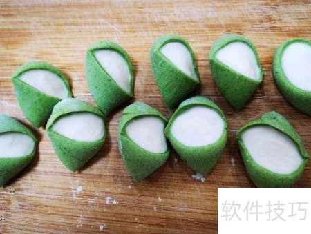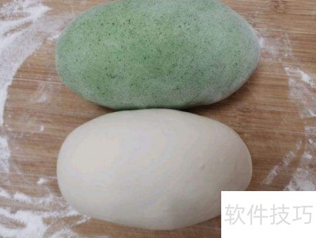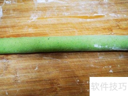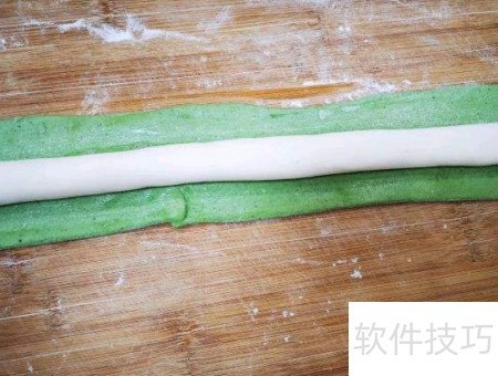 13、 将菠菜焯水后榨汁,用以和面制成绿色面团,另备白色面团。将绿色面团擀开,包入白色面团,搓成光滑圆条。