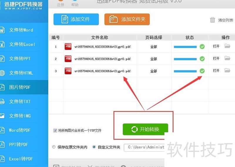 4、 第四步,点击右侧开始转换按钮,稍等片刻。转换完成后,点击设定的文件夹路径,即可清晰查看JPG图片已成功转为PDF格式。