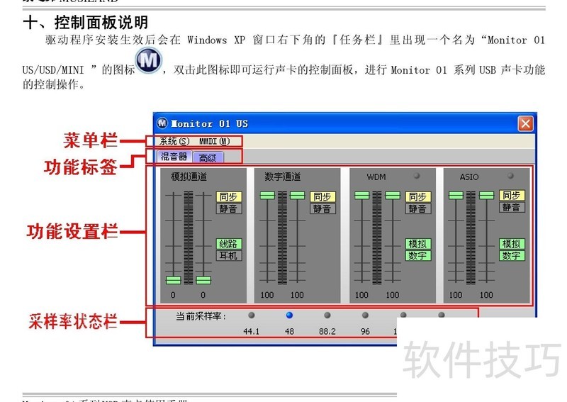 、 本文是乐之邦声卡Monitor 01USD型说明书,详细说明产品使用步骤及常见问题的解决方法,帮助用户更好地操作和维护设备。