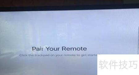7、 开启显示屏后,配置界面将自动弹出。使用遥控器轻触上方触摸区域,若提示连接异常,请将遥控器靠近 Apple TV。如仍无法配对,同时长按 MENU 键与音量加键持续两秒,重新启动连接流程。