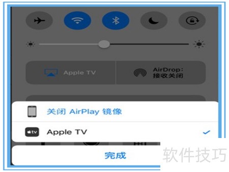 7、 在Apple TV设备右侧出现勾选标志后,点击下方完成即可结束移动设备的设置。此时电视应已显示投射内容。返回先前界面,可随时停止镜像操作,断开连接。