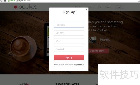 1、 打开Chrome浏览器,在地址栏输入https://getpocket.com,或通过百度搜索Pocket找到官网。进入Pocket的网页首页后,页面会展示相关功能介绍。新用户需先点击Sign Up完成注册,注册完成后返回登录页面,点击Login In并输入账号信息即可成功登录,开始使用Pocket的各项服务。