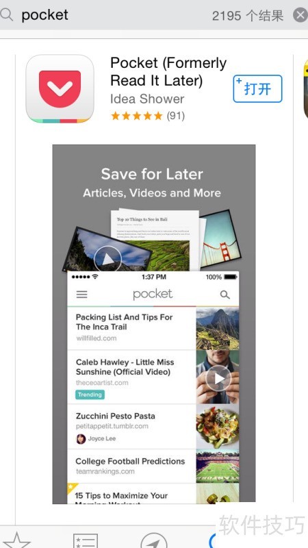 6、 在公交车、咖啡馆或餐厅等无法使用电脑的场合,只需拿出智能手机,利用Pocket应用即可随时阅读。以iPhone为例,前往App Store搜索Pocket,下载并登录后,未读内容一目了然,点击即可开始阅读,读完勾选标记完成。操作简单流畅,极大提升了碎片时间的利用率,让信息获取更加高效便捷,真正实现随时随地轻松阅读,享受科技带来的智能体验。