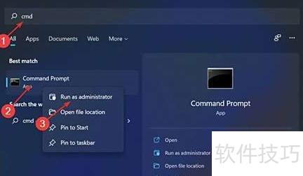 1、 按下Win+S打开搜索,输入cmd并以管理员身份运行。