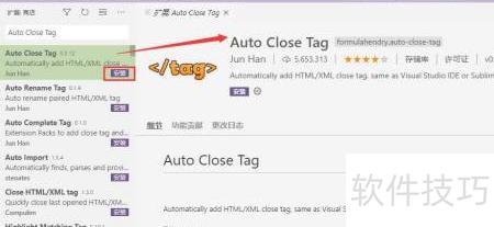 6、 点击图中Auto Close Tag,右侧将显示插件详情,随后点击安装按钮即可完成扩展的安装。