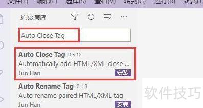5、 在扩展界面的搜索框内键入Auto Close Tag,即可找到相关插件,所示。