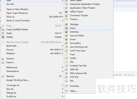 4、 用鼠标选中新建的Java项目,点击右键,选择New中的Class类,操作所示。