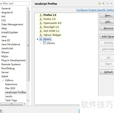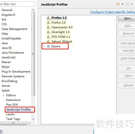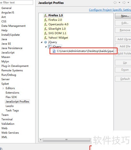 4、 在Spket中打开JavaScript配置,发现缺少Ext,点击新建按钮,选择添加jQuery支持。