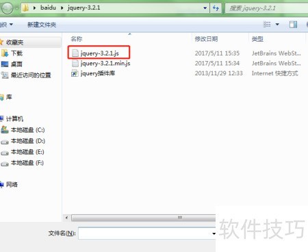 6、 选中jQuery后,点击右侧的添加文件,找到并选择jquery-3.2.1.js文件。