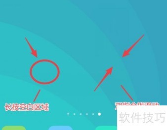 1、 长按桌面空白处或双指向内滑动即可显示功能菜单。