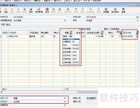1、 新增请购单,选择请购类型,填写产品、数量及需求日期,维护请购人与所属部门信息。