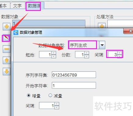 2、 进入普通文本的属性设置,选择数据源,将默认数据修改为序列生成,设定间隔为3,生成数值1,最后保存更改。
