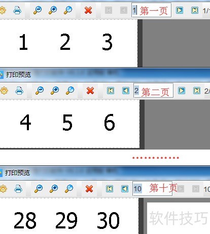 4、 完成上述步骤后,普通拼版即已生成。打印预览时可看到第一页标签数据为123,翻页后依次显示456,直至最后一页标签内容为28、29、30,实际效果所示。