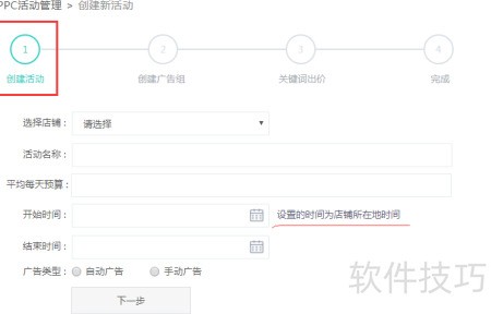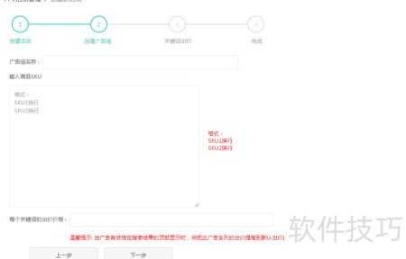 5、 点击下一步进入创建广告组页面,按提示填写广告组名称,输入商品SKU,并为每个关键词设置出价。