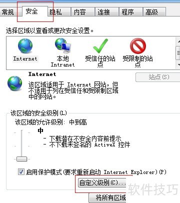 3、 切换到安全选项,点击自定义级别进入设置。