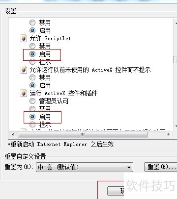 6、 找到允许Scriptlet及运行ActiveX控件和插件的选项,将其启用并勾选,最后点击确定按钮完成设置。
