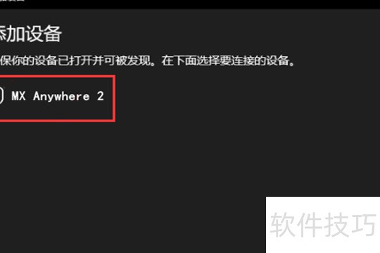 10、 在电脑的设备列表中找到 MX Anywhere 2,点击进行配对操作。连接成功后,鼠标对应信道的指示灯将停止闪烁,持续稳定亮起约5秒钟,表明罗技MX Anywhere 2蓝牙鼠标已成功与电脑连接并可正常使用。