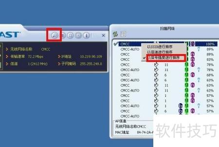 2、 点击第一个放大镜图标按钮,会弹出一个菜单,其中列出多个无线网络。通过右键点击并选择按信号强度排序,可清晰查看各网络信号强弱,进而挑选信号最强的网络进行连接,操作简便直观。