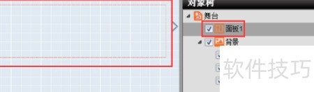 2、 在对象树中选择舞台,用工具栏的面板工具在舞台上绘制一个框。