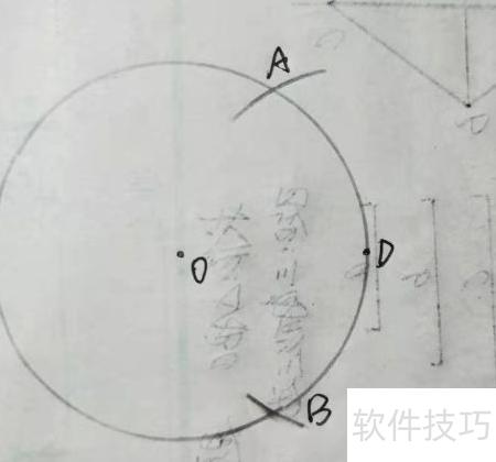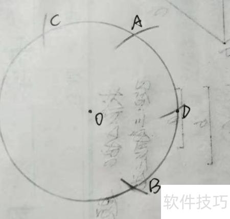 3、 在圆周上任选一点D作为半径,用相同长度画弧,分别与圆相交于A、B两点。