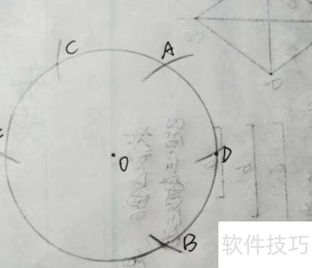 4、 以A点为圆心,相同半径画弧,与圆相交于C、D两点,所示。