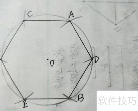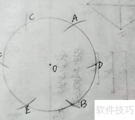 6、 以F点为圆心,相同半径画弧,与圆相交于C、E两点,所示。