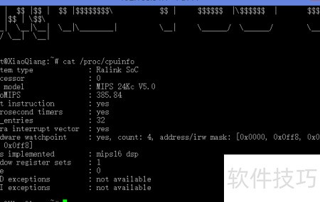 20、 通过Putty远程连接路由器,执行cat /proc/cpuinfo命令,可查看当前CPU的详细信息。