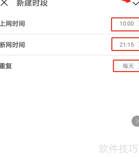 6、 根据需求设定上网和断网时间,可选择每日或仅工作日生效,设置完成后点击右上角确认即可。