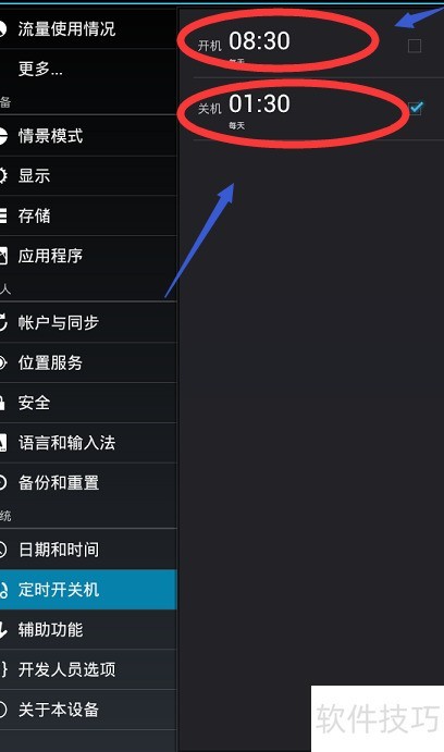 5、 选择此项后,右侧将显示开关机设置窗口,上方为开机设置,下方为关机设置。