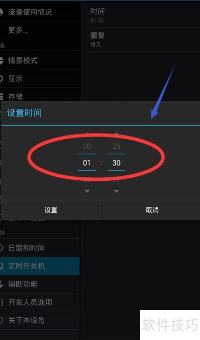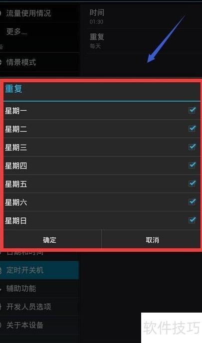 6、 点击这两个选项即可进入相应设置界面。以关机为例,点击后会显示时间和重复两个设定项。先选择时间设定关机时刻;若需设定周期性关机,可点击重复选项,根据需求选择具体重复日期,实现定时自动关机功能。